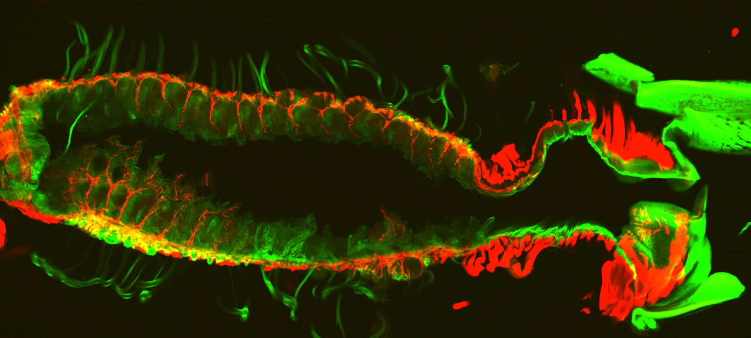 The impact of this unique feature on the two functions of the pump is being investigated through simultaneous visualization of the dragonfly’s valve kinematics and the resulting jets. Our results indicate that by controlling the individual anal valve leaflets, the larva directs its propulsion jet straight using a symmetric nozzle opening (fig. a), while diagonally deflecting its respiratory jet when using an asymmetric nozzle opening (fig. b). The straight jet appears to reduce the thrust loss during propulsion due to side-thrust generation, while the deflected jet seems to induce a secondary entrainment flow during respiration that is favorable to clean and efficient breathing.